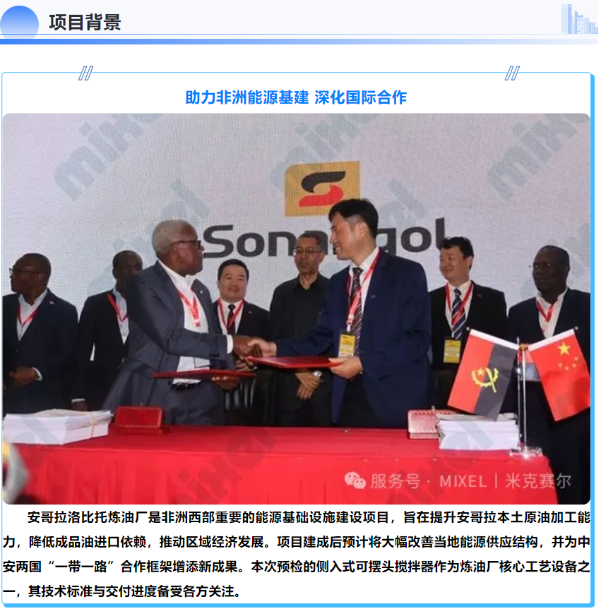 安哥拉洛比托炼油厂是非洲西部重要的能源基础设施建设项目,旨在提升安哥拉本土原油加工能力,降低成品油进口依赖,推动区域经济发展。项目建成后预计将大幅改善当地能源供应结构,并为中安两国“一带一路”合作框架增添新成果。本次预检的侧入式可摆头搅拌器作为炼油厂核心工艺设备之一,其技术标准与交付进度备受各方关注。